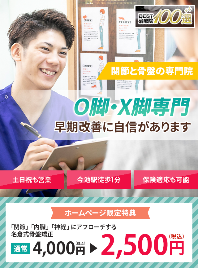今池名倉堂鍼灸整骨院では、 O脚・X脚の原因を「骨盤の歪み」「筋力不足」と考えています。