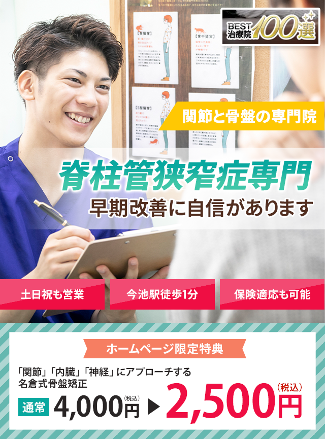 今池名倉堂鍼灸整骨院では、 脊柱管狭窄症の原因を「骨盤の歪み」と「背骨の歪み」と考えています。